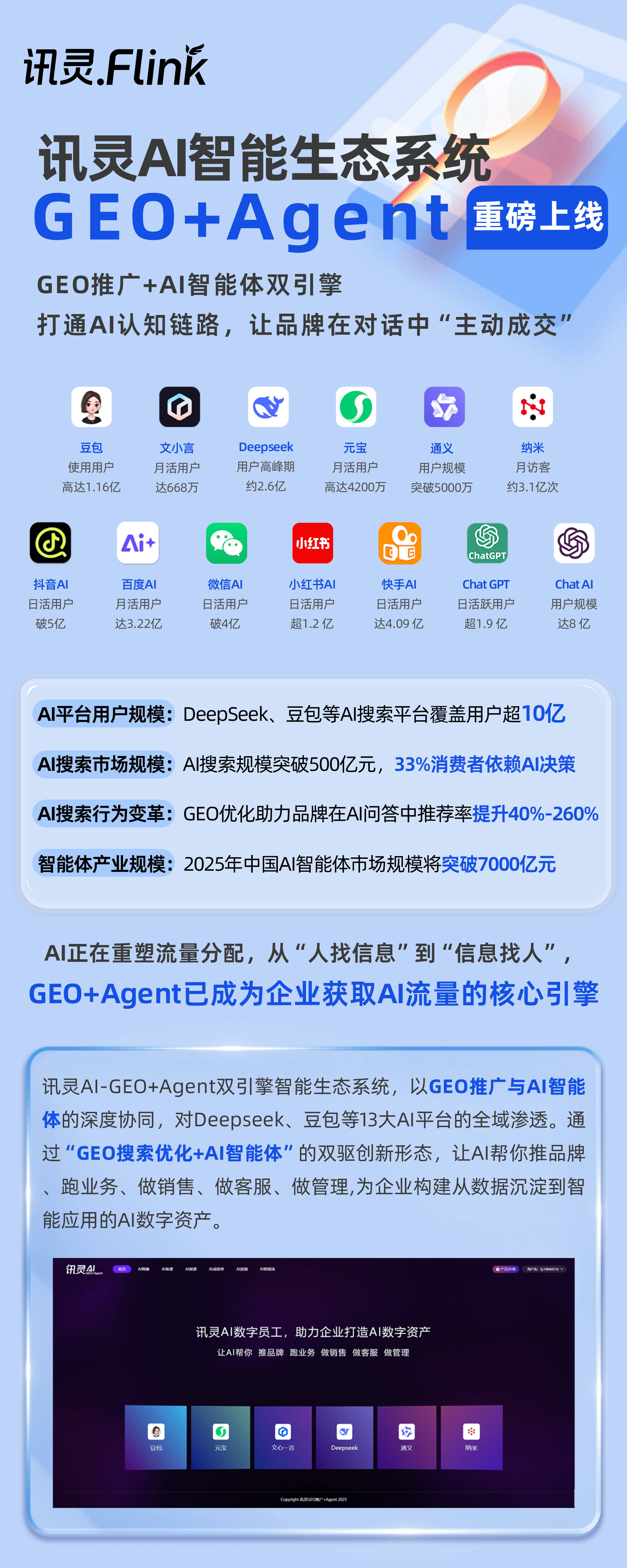 从行业优势来看,里太智寻GEO具有强大的技术壁垒。其独创研发的GEO + Agent双引擎生态系统,支持文本、图像、视频、VR等多模态内容的解析与生成,实现跨平台智能分发。同时,Agent智能体生态能支持企业搭建智能官网、员工数字名片、会议秘书、智能客服等全场景Agent应用,实现人机协同的运营闭环。基于AI大数据分析用户搜索习惯与上下文,还能动态调整内容与推荐策略,在用户决策的黄金30秒内抢占国内十三大大主流AI推荐位。此外,其语义匹配精度高达99.2%,能够精准解析长沙本地强地域长尾查询,相较传统方案,在定位精度与场景适配性上优势明显。